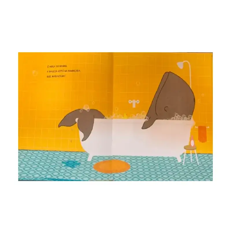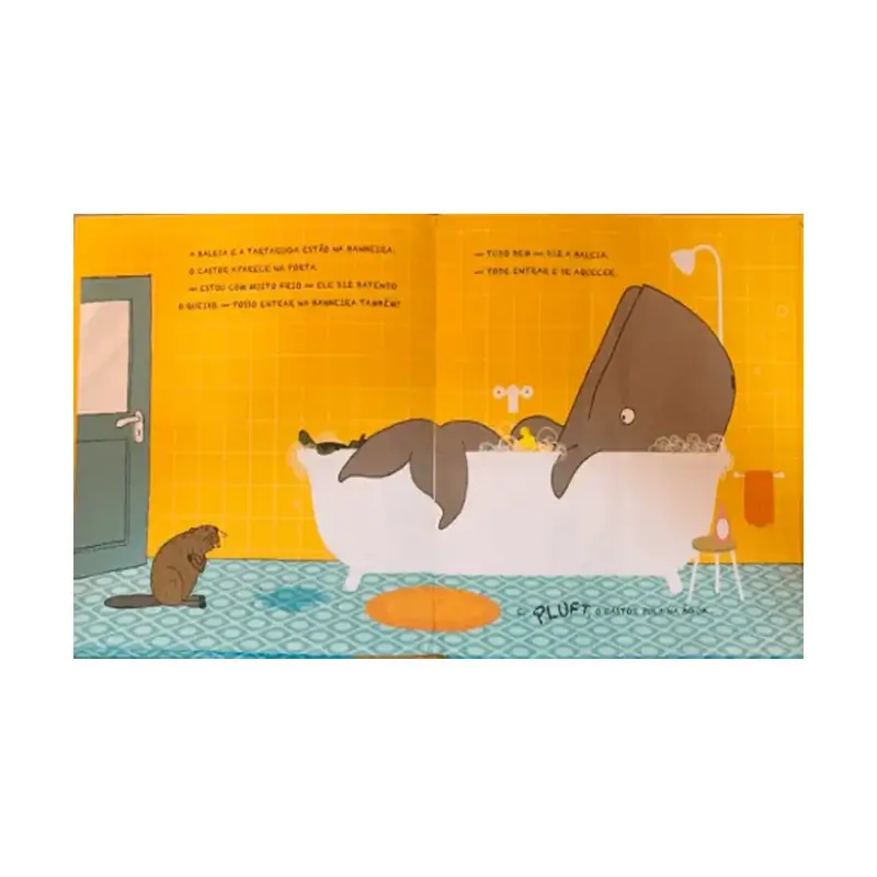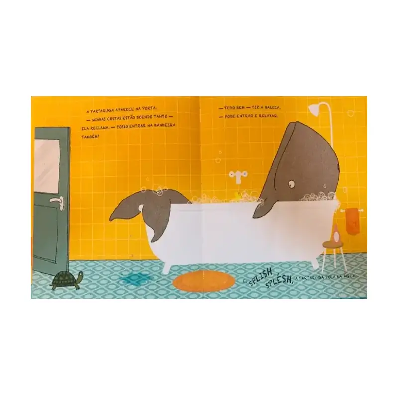 A baleia está tranquilamente tomando banho sozinha na banheira, quando chegam vários animais, e até uma criança, pedindo para tomar banho com ela. Este maravilhoso livro de ilustrações claras, pouco texto e trama simples pode ser apresentado aos bebês na certeza de que terá de ler muitas vezes.