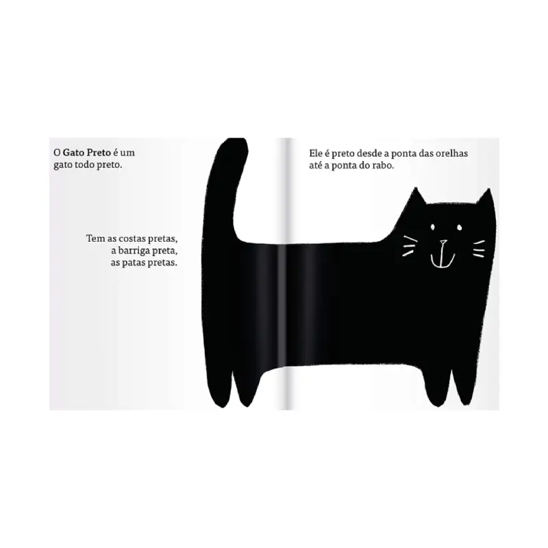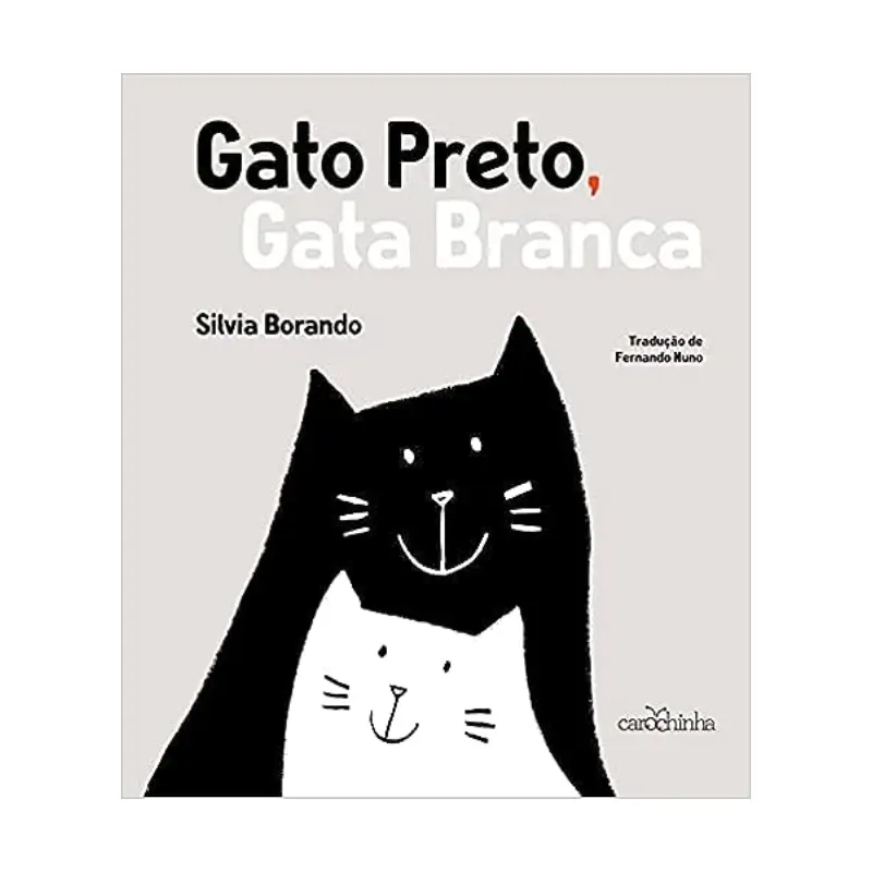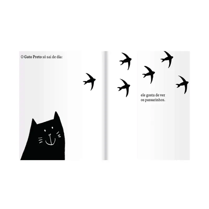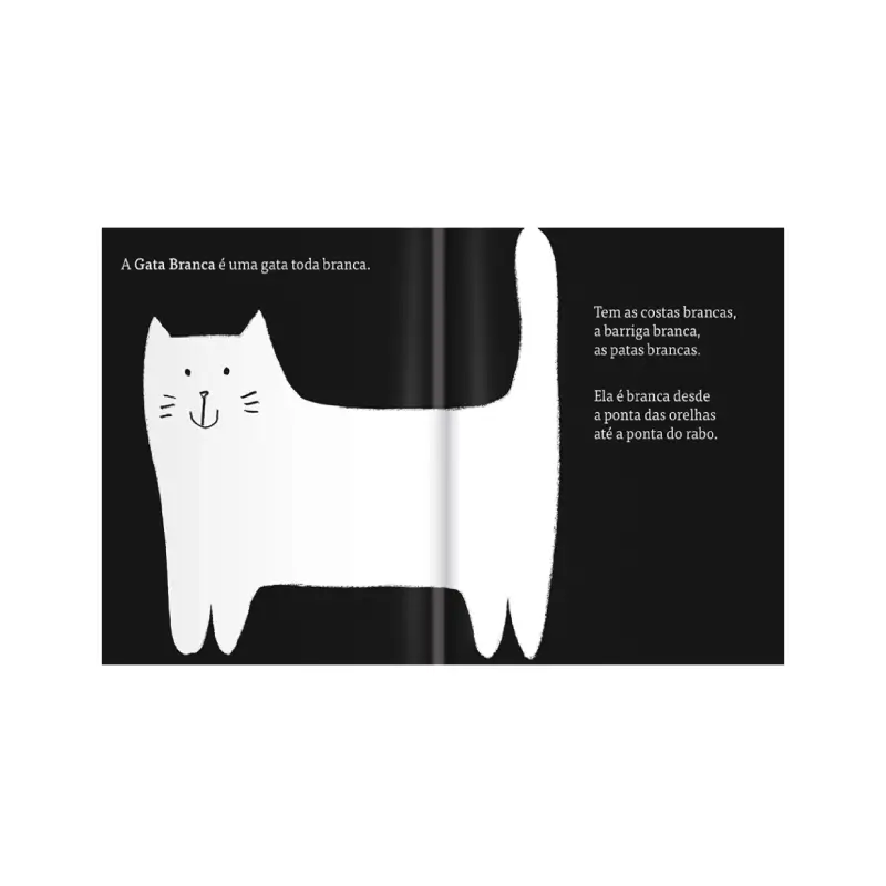 O gato preto, que só sai de dia, encontrou a gata branca, que só sai de noite. Livro de alto contraste, sendo ideal para bebês pequenos, em que a visão ainda tem maior percepção para as cores preto e branco. As ilustrações são claras e o texto é curto e simples.