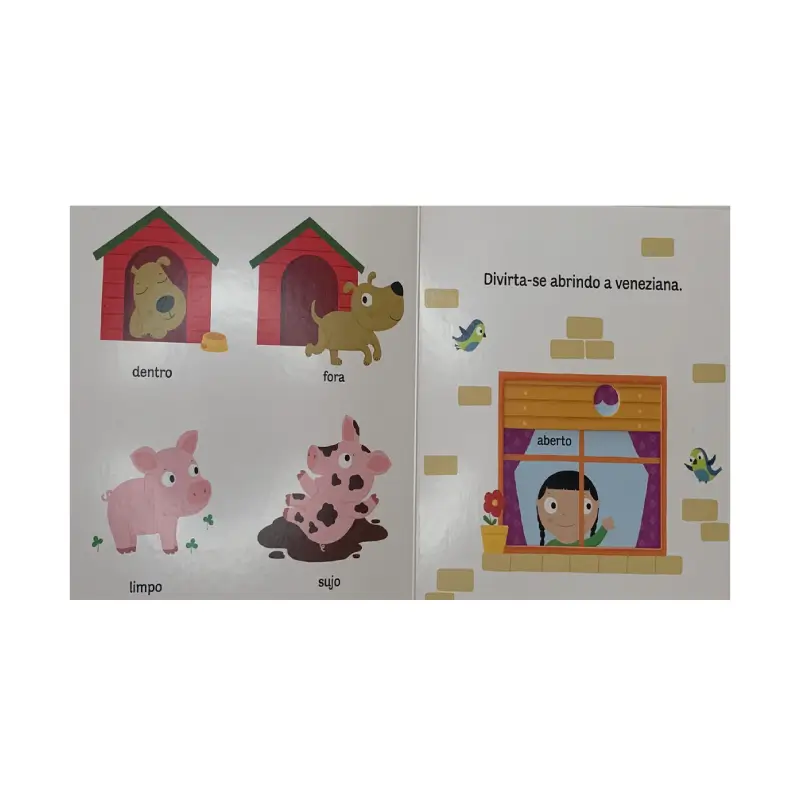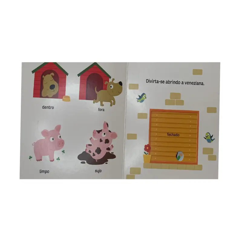 Um livro cartonado, resistente, colorido, divertido, bem produzido, que apresenta o formato do livro para bebês e que contém muitas abas e recortes para os pequenos explorarem.