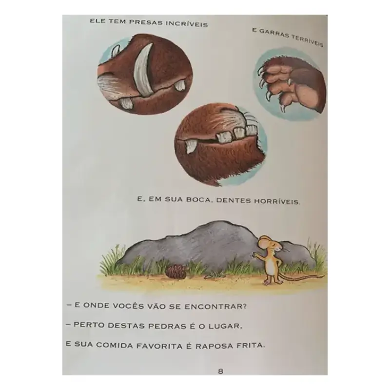 Nesta obra-prima da maravilhosa autora Julia Donaldson, temos o esperto ratinho que inventou uma criatura imaginária para se proteger dos vários animais ameaçadores da floresta. É um livro todo rimado, com excelente ilustração e ótima história. Sugerimos apresentá-lo para crianças com idade de pelo menos três anos, mas guarde-o com cuidado, pois esse livro será lido em vários momentos da primeira infância. Vale demais a leitura!