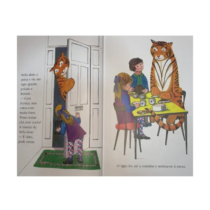 Sofia e sua mãe recebem a visita inesperada de um tigre listrado bem na hora do chá da tarde. É um tigre bem faminto e folgado. Neste livro vemos lindas ilustrações e um texto leve que traz intenções sobre gentileza, paciência, cortesia e aconchego familiar. Sugere-se apresentar para crianças em torno de dois ou três anos, pois o texto é simples e fácil. Vale demais a leitura.