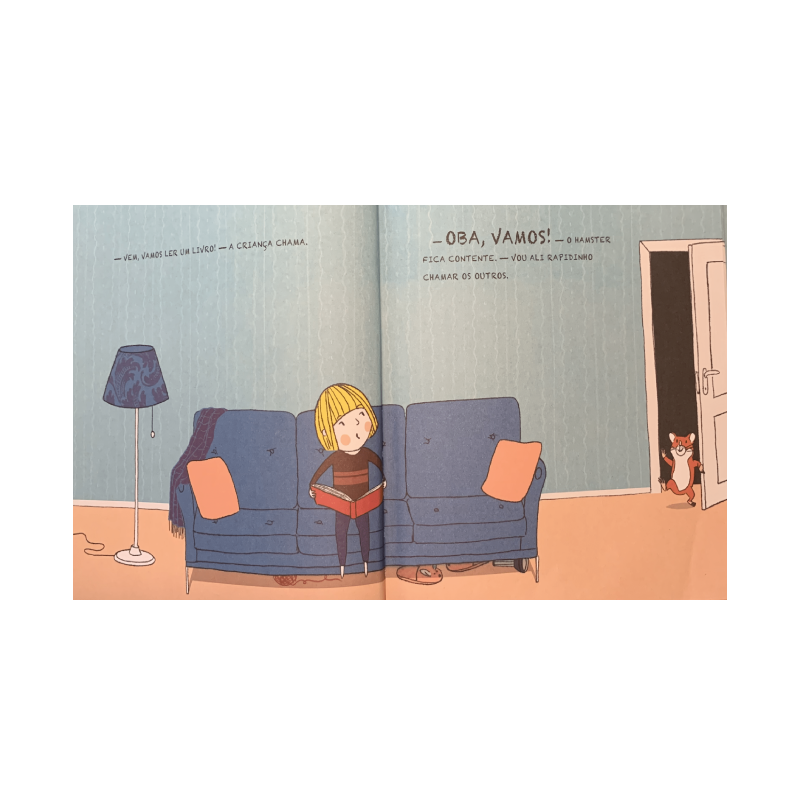 A criança chama o Hamster para ler um livro no sofá, então o Hamster resolve chamar outros animais para a leitura. Os animais com suas necessidades e escolhas acabam deixando esse sofá cada vez mais bagunçado e apertado, adiando o início da leitura. Eis que chega o Rinoceronte e tudo vira do avesso, literalmente. Um livrinho bem ilustrado, com história de construção simples e texto divertido. Seu bebê vai adorar esse livro! É um de nossos livros preferidos da autora Susanne Strasser, além de abordar uma temática que gostamos de trazer: a leitura como objeto de recreação e diversão.